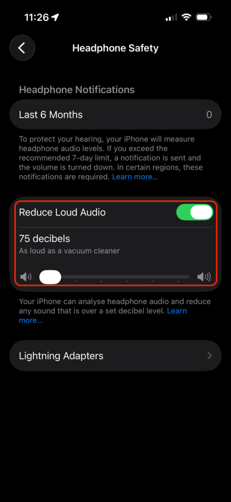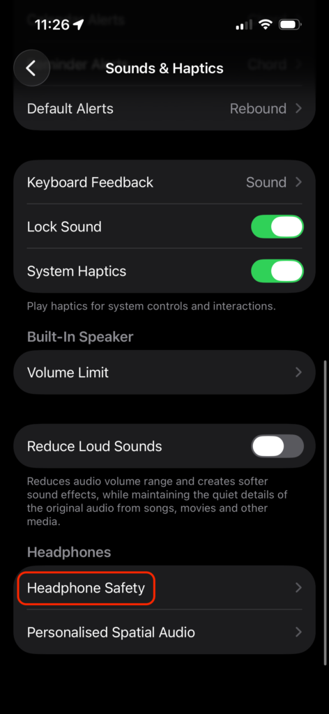 Quick tip if you’re on iPhone: Go to Settings → Sounds & Haptics → scroll to the bottom → Headphone Safety. In there you’ll find a decibel slider and a “Reduce Loud Audio” toggle. Turn that toggle on. The slider lets you set a maximum volume limit for your headphones — basically telling your phone “never let audio go louder than this.” What’s cool is Apple shows you a real-world comparison for each level: 75 decibels is roughly as loud as a vacuum cleaner, for example. I keep mine on one of the lower settings and switch on Reduce Loud Audio. Trust me — with the XM5’s noise cancelling doing its job, you don’t need anywhere near full volume. It’s more than enough for most people, and the difference to your long-term hearing is real.